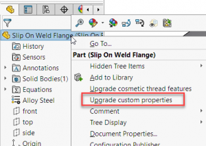 要手动升级,请在 FeatureManager 中单击鼠标右键选择“升级自定义属性”。这是一种单向升级,无法撤消。升级后,将不会再在模型上看到此选项,并且旧模型将具有与新 2022 模型相同的自定义属性架构。